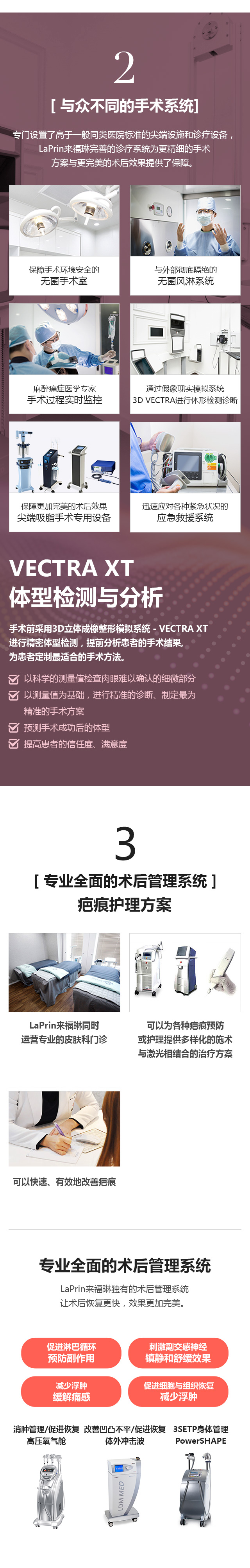专门设置了高于一般同类医院标准的尖端设施和诊疗设备, LaPrin来福琳完善的诊疗系统为更精细的手术方案与更完美的术后效果提供了保障。