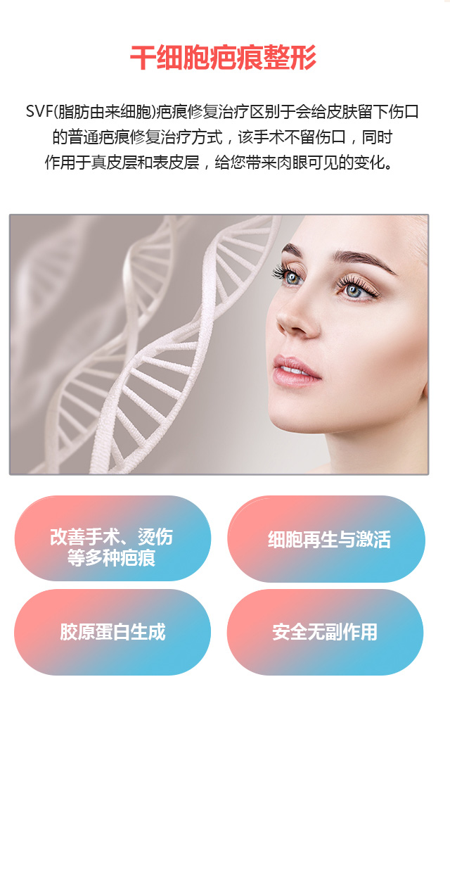 SVF(脂肪由来细胞)疤痕修复整形术采用从自体脂肪提取的SVF(脂肪由来细胞)注入皮肤的方式,促进生长因子分泌、肌肤再生以及胶原蛋白的生成,可以有效去除皮肤上的疤痕。
