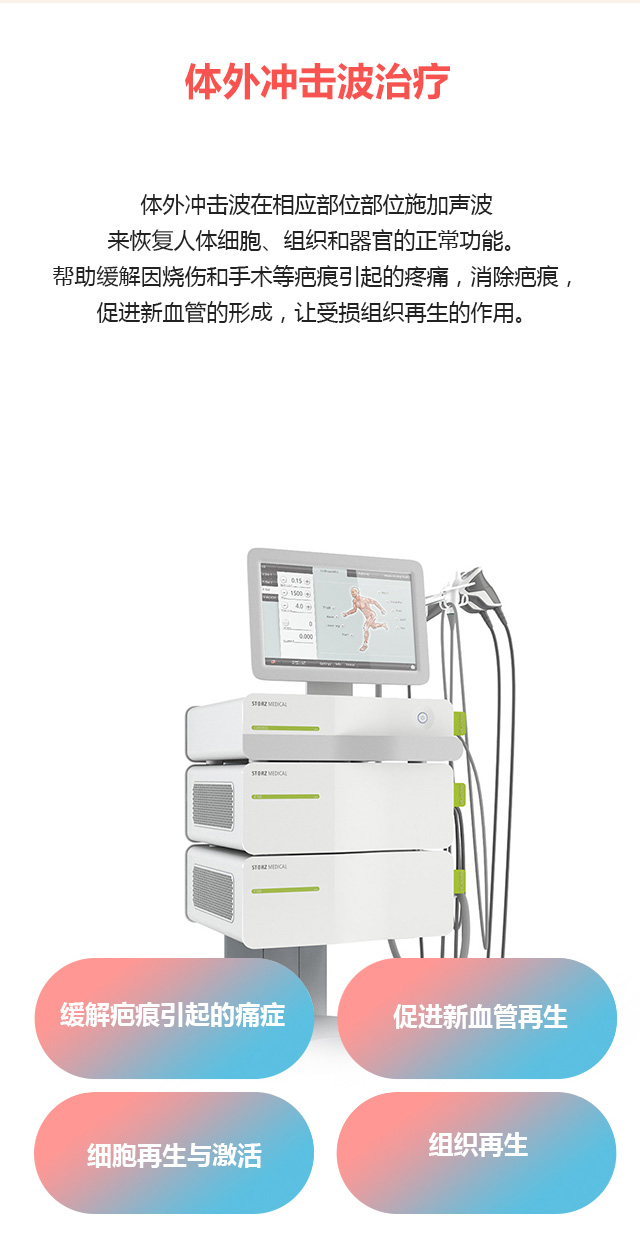 改善手术、烫伤等多种疤痕 / 细胞再生与激活 / 胶原蛋白生成 / 安全无副作用 体外冲击波治疗