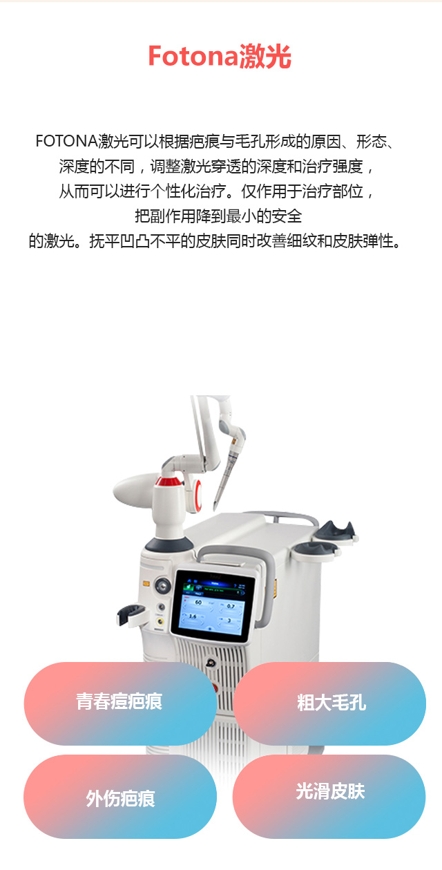 FOTONA激光可以根据疤痕与毛孔形成的原因、形态、深度的不同,调整激光穿透的深度和治疗强度,从而可以进行个性化治疗。仅作用于治疗部位,把副作用降到最小的安全的激光。