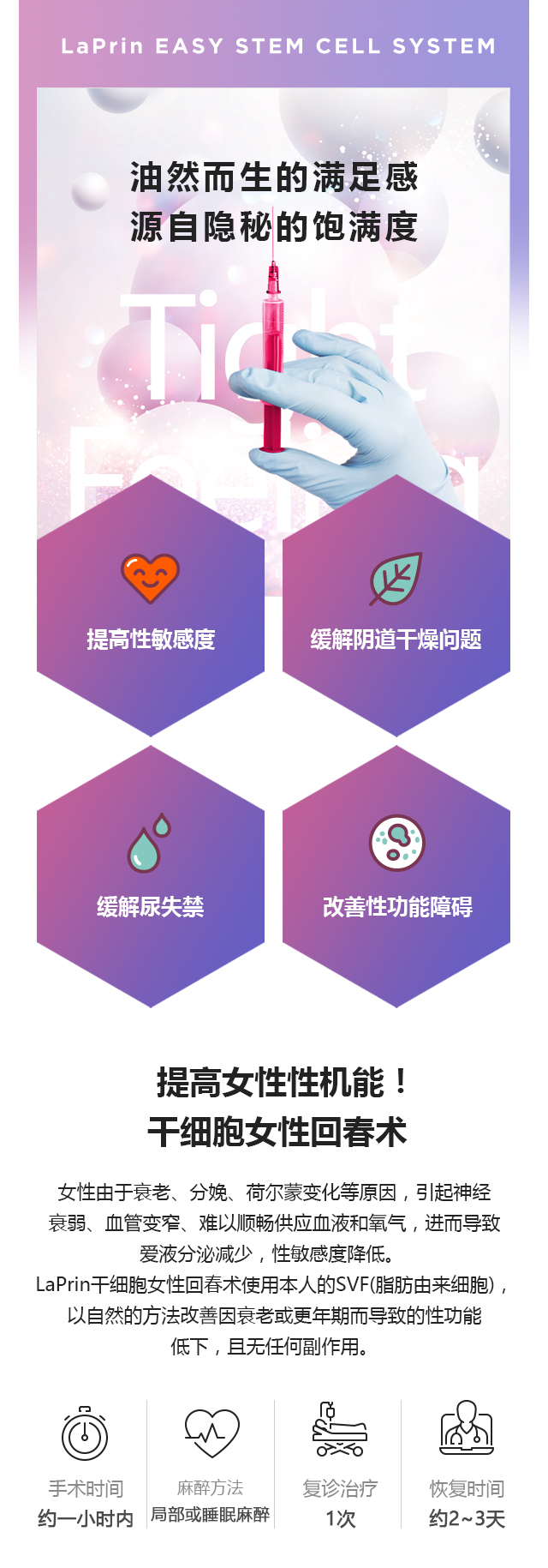 女性由于衰老、分娩、荷尔蒙变化等原因,引起神经衰弱、血管变窄、难以顺畅供应血液和氧气,进而导致爱液分泌减少,性敏感度降低。 LaPrin干细胞女性回春术使用本人的SVF(脂肪由来细胞),以自然的方法改善因衰老或更年期而导致的性功能低下,且无任何副作用。