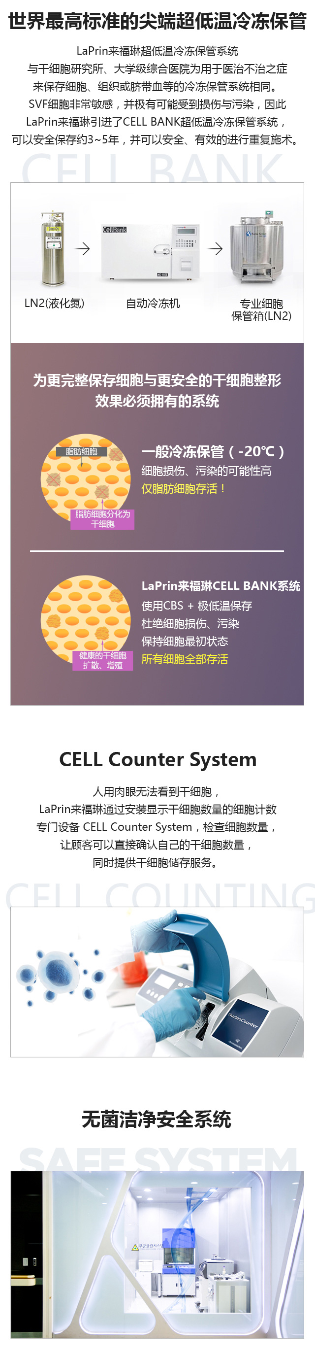 LaPrin来福琳超低温冷冻保管系统 与干细胞研究所、大学级综合医院为用于医治不治之症来保存细胞、组织或脐带血等的冷冻保管系统相同。 SVF细胞非常敏感,并极有可能受到损伤与污染,因此LaPrin来福琳引进了CELL BANK超低温冷冻保管系统, 可以安全保存约3~5年,并可以安全、有效的进行重复施术。