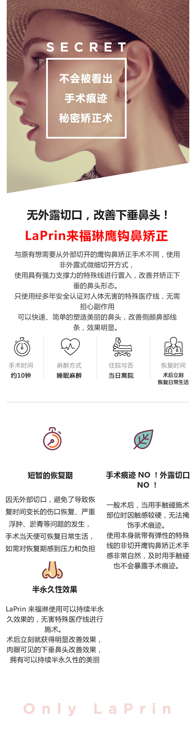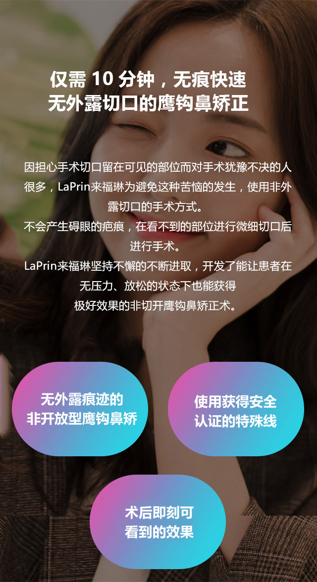 因担心手术切口留在可见的部位而对手术犹豫不决的人很多,LaPrin来福琳为避免这种苦恼的发生,使用非外露切口的手术方式。不会产生碍眼的疤痕,在看不到的部位进行微细切口后进行手术。LaPrin来福琳坚持不懈的不断进取,开发了能让患者在无压力、放松的状态下也能获得极好效果的非切开鹰钩鼻矫正术。