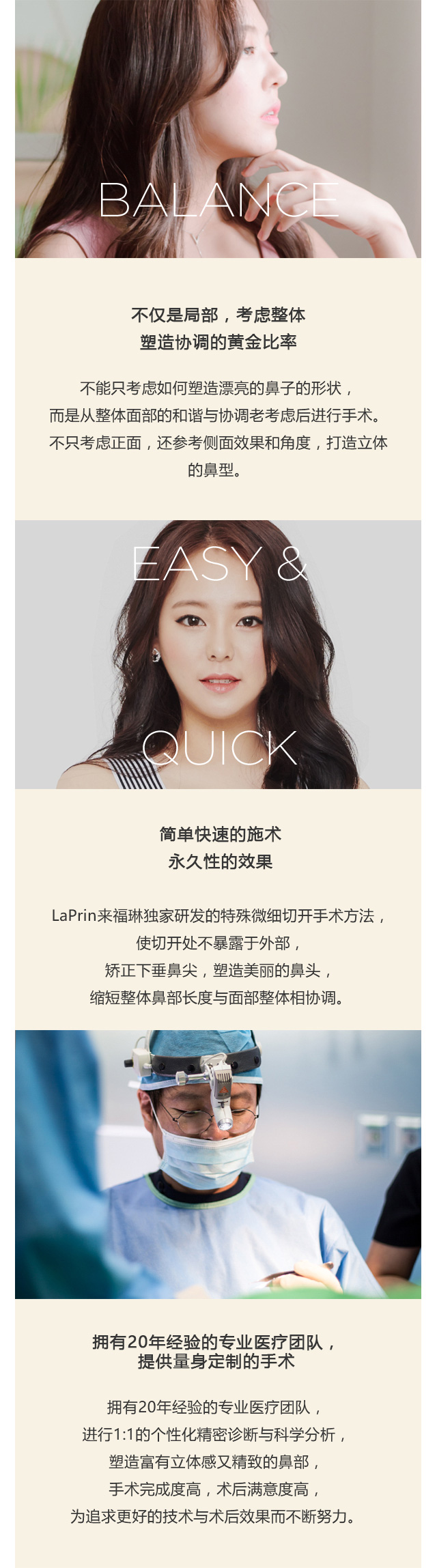 美观的鼻子固然重要,但作为人体器官,鼻子本身具有多种功能,整形时必须考虑到这些功能性问题。 LaPrin来福琳为了同时实现美观和功能性,在鼻整形专门医疗团队紧密的协诊系统下,对所有手术进行计划并执行 。