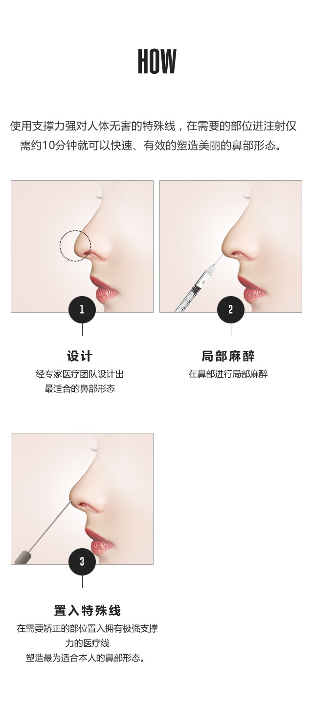 使用支撑力强对人体无害的特殊线,在需要的部位进注射仅需约10分钟就可以快速、有效的塑造美丽的鼻部形态。