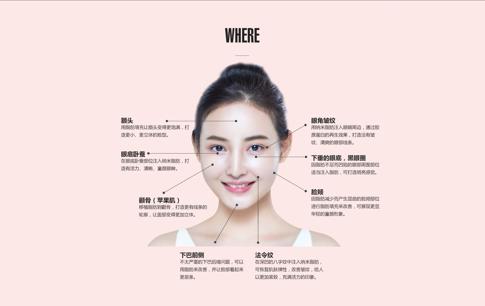 法令纹 - 在深凹的八字纹中注入纳米脂肪,可恢复肌肤弹性,改善皱纹,给人以更加紧致,充满活力的印象。
